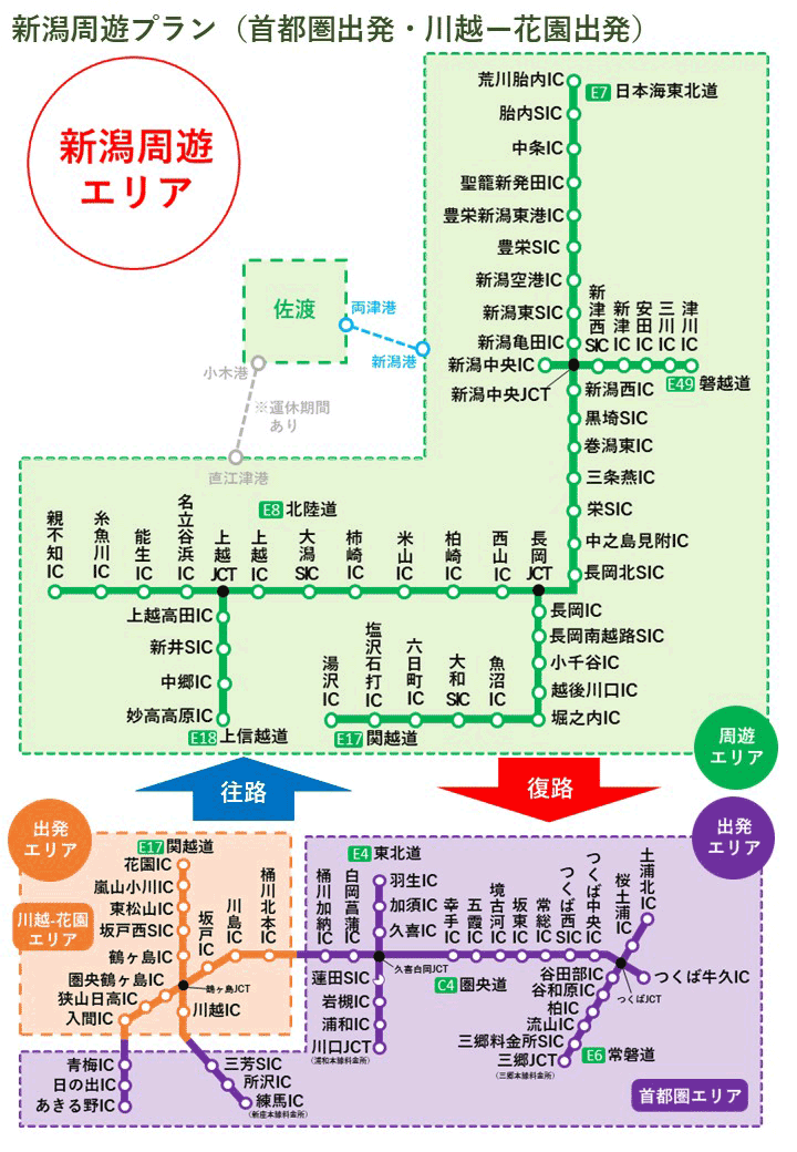 首都圏エリア、川越-花園エリアの各出発エリア内のICから新潟県内の周遊エリア内のICまでの1往復分と周遊エリア内が定額で乗り降り自由となる商品です。ご利用は平日・休日問わず連続する最大3日間です。