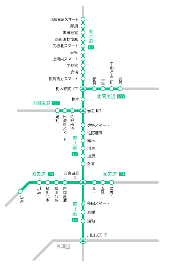 • 川口JCTでは東京外環道、首都高速道路からも連続してご利用いただけますが、本プランの料金とは別に東京外環道、首都高速道路の通行料金が必要です。