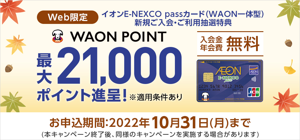 2022年9月1日(木)~10月31日(月)の期間中に、WEBより対象カードに新規でお申込みいただき、発行されたカードで2022年12月10日(土)までにクレジット払いをご利用いただいた方に抽選で、最大21,000WAON POINTを進呈いたします。