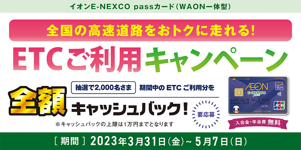 期間中、対象カードをイオンウォレットにご登録いただき、ご応募のうえ、対象カード付帯のETC専用カードご利用で、抽選で2,000名さまに期間中のETCご利用分に対し1万円を上限として全額キャッシュバックいたします。