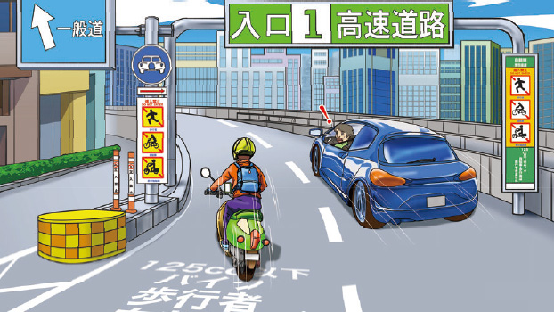 高速道路(高速自動車国道及び自動車専用道路である一般有料道路)においては、歩行者、軽車両、原動機付自転車等の通行が禁止されています。事前に確認し、高速道路への誤進入をしないように注意しましょう。