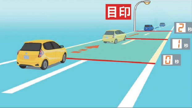 前を走る車両との間隔を「距離」ではなく「時間」で計る方法です。つかず・離れず「約2秒」の間隔をキープしていただくことで、事故と渋滞をダブルで予防することができます。