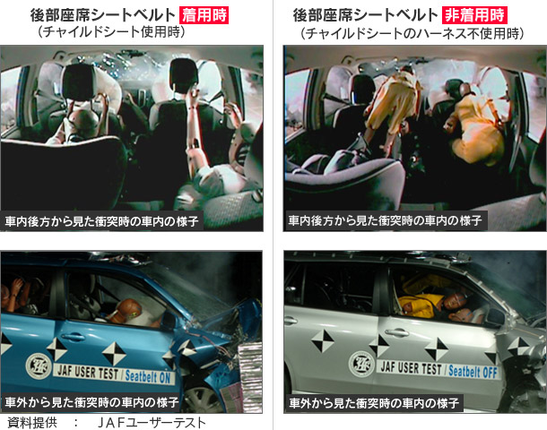 - 事故の衝撃により、後部座席同乗者が運転席・助手席同乗者や座席シート等に衝突し、運転者や助手席同乗者に重大な被害を与えたり、後部座席同乗者も重大な被害を受ける危険性。