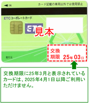 東/中/西日本高速道路株式会社が発行するETCコーポレートカード及びクレジットカード会社が発行するETCクレジットカードについて有効期限が本年3月末までとなっているカードが多数ありますので、ご注意ください。