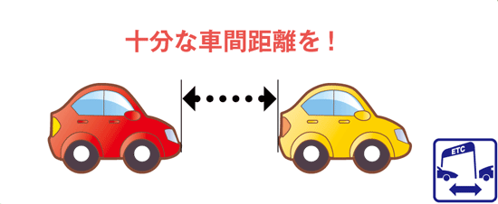 ETCカードの挿し忘れやETCレーンに誤って進入する車両などにより開閉バーが開かず、前方の車両が停止する場合がありますので、ETCレーンを通行される際は、特に以下にご注意ください。