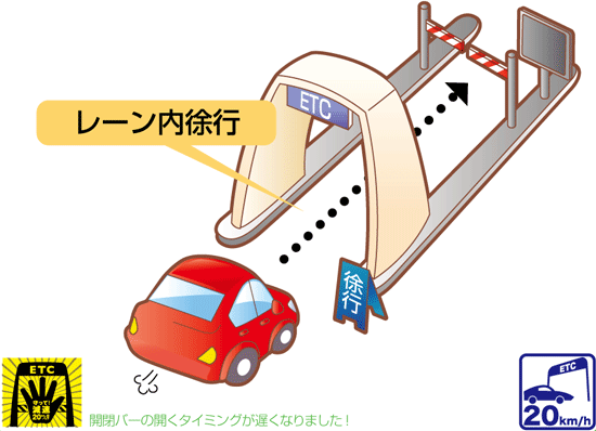 ETCレーンでは、誤進入やカード未挿入等により、前車の停止や開閉バーが開かないことなど不測の事態が発生する場合もありますので、お客さまの安全を確保するためにも、20㎞/h以下に減速の上、ETCレーンは徐行して通行してください。