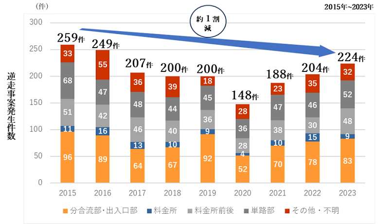 | データ: | 2015年~2023年の高速道路(国土交通省及び高速道路会社管理)における事故または確保に至った逆走事案 N=1879 |