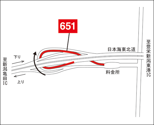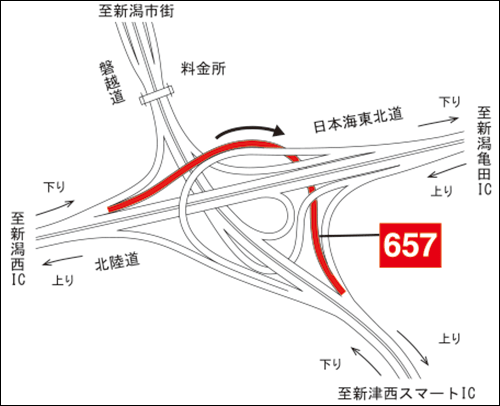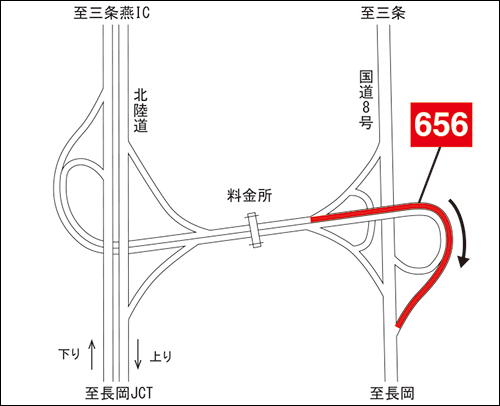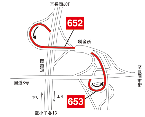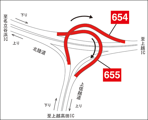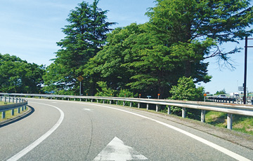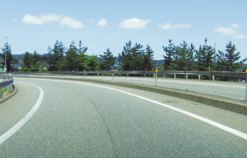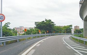 本線からランプに進入した後急カーブが続くが、急カーブが長く続くことや高架下を通るため見通しが悪いことにより、スリップしやすい路面湿潤時において、車道左側への衝突が発生しやすい。