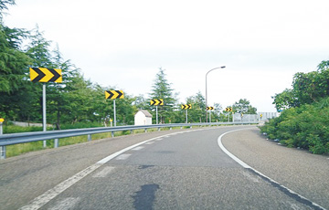 上り勾配のためアクセルを踏んだまま右急カーブを直進するため、速度超過による車道左側への衝突が発生しやすい。