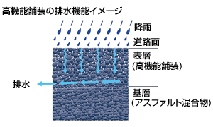 この舗装は、舗装の上部に従来より空隙(すき間)を多くつくってあるため、雨が降るとそのすき間に水がしみ込むので、路面に水が溜まらないんです。そのため、クルマが巻き上げる水しぶきが減って、前が見ずらくならないというものなんです。