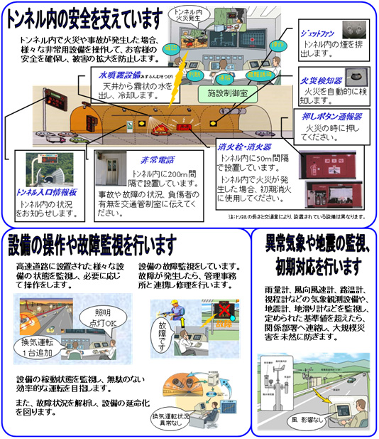 道路管制センターは、道路や交通の流れに関することを取り扱う交通管制部門と、高速道路上にあるさまざまな電気系の設備を管理する施設制御部門の2つからなります。