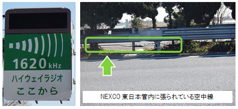 ハイウェイラジオは、中央分離帯や路肩にある「空中線」とよばれる電線のようなものから電波を配信しています。「ハイウェイラジオここから」と「ハイウェイラジオここまで」の看板の間に空中線が張ってあり、その区間はおよそ3kmです。
