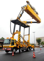 遮音壁外装板の点検保守や補修作業に使用します。遮音壁に近づいて作業ができるよう、アームが遮音壁の高さを超えて、遮音壁背面に作業台を配置します。