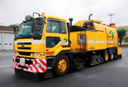 作業に応じて装置を載せ替えて、中央分離帯部分の樹木剪定やのり面の草刈り、トンネル照明灯具清掃、除雪作業など様々な作業を行うことができる車です。この写真はトンネルの側壁の洗浄を行うための装置を取り付けた状態です。
