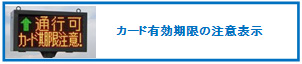その他、ETCカードの有効期限の30日前からは、「カード期限注意」というアナウンスも行います。ご利用の際に、「カード期限注意!」の表示を確認しましたら、お早めに新しいETCカードへの切り替えをお願いいたします。