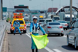 1人の隊員は、旗を振って隊員の存在をドライバーに知らせるとともに、車の流れが途切れたところで、笛でもう一人の隊員に合図をします。その合図を受けて、もう一人の隊員が落下物のところまで走って行き、回収を行います。車の流れが途切れないと回収に向かえないため、とても長い時間、旗を振り続けなければならない時もあります。
