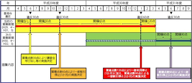 例:累積違反点数180点⇒一部利用停止(3か月)、210点⇒一部利用停止(4か月)など