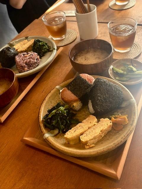 こちらのカフェは様々な種類のおむすびを提供していて、私は好きなおむすびを2つ選べる「おむすびセット」でごま高菜とスパムを選びました~♪