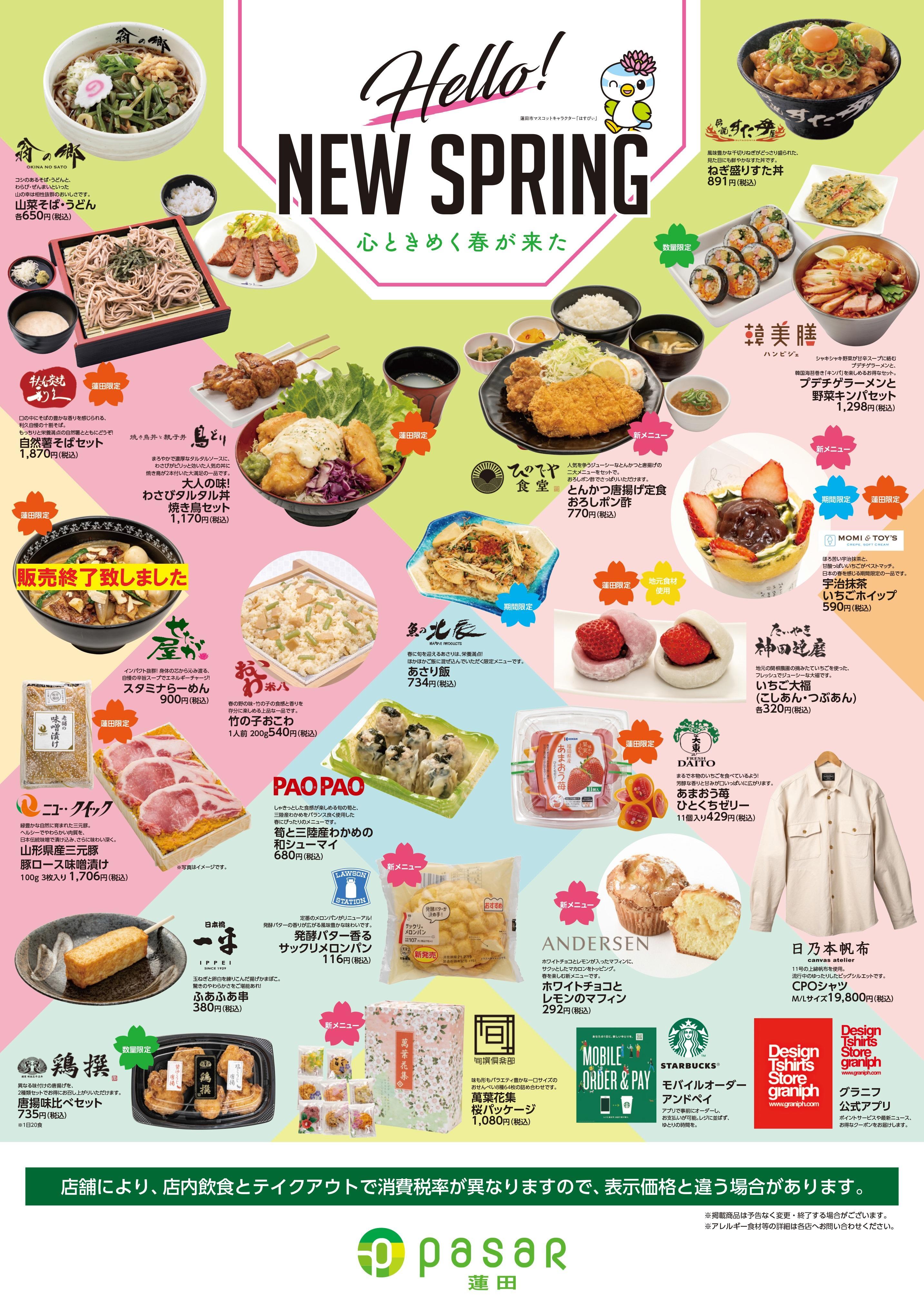 【心ときめく春が来た】 Hello! NEW SPRING❀ HELLO! NEW SPRING❀ 心ときめく春が来た♪ いつもPasar蓮田をご利用いただき 誠にありがとうございます! 心も身体もウキウキする春の季節にピッタリの 商品やメニューが勢ぞろい☆彡(´っ・ω・)っ 新メニューやPasar蓮田限定商品 期間限定商品・数量限定商品も!! ぜひ、Pasar蓮田で 楽しいひとときをお過ごしください(*'▽')