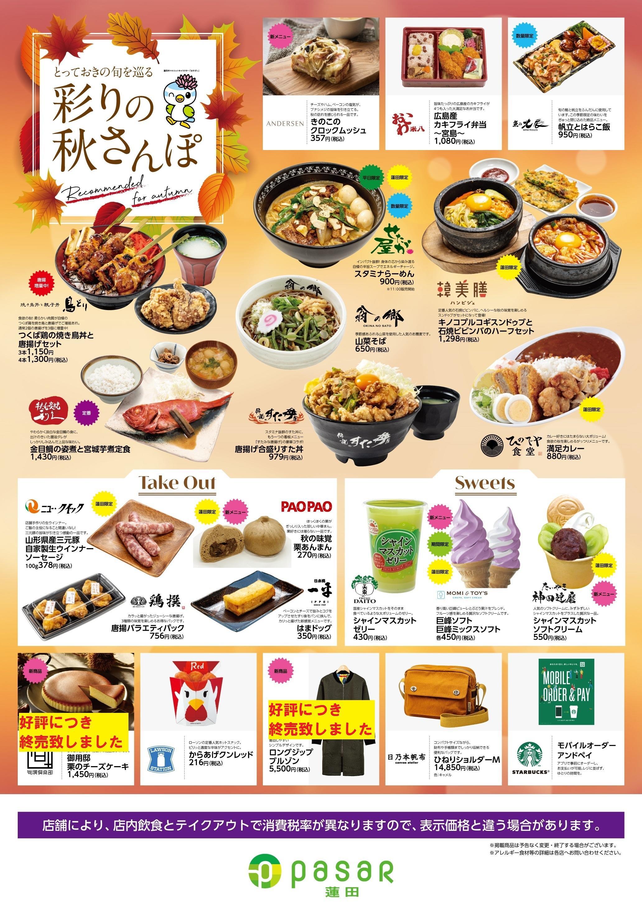 【秋のオススメ】 ~とっておきの旬をめぐる~ 彩りの秋さんぽ 【 ☆秋のオススメ☆ 】 ~とっておきの旬をめぐる~ 彩りの秋さんぽ 食欲の秋にピッタリのキノコや栗といった秋の味覚をふんだんに使った新メニューが続々と登場しています! 蓮田限定や数量限定、期間限定のものもございますので、ぜひこの機会をお見逃しなく☆彡