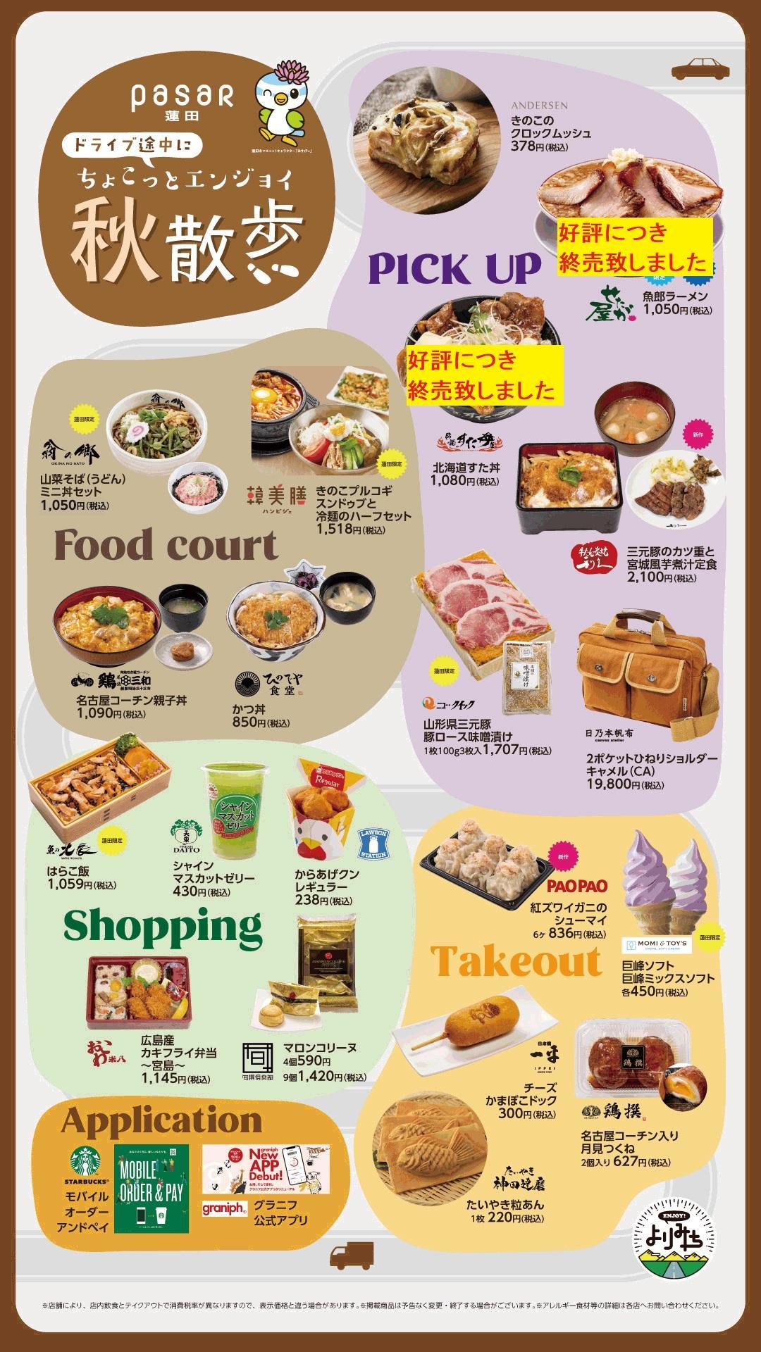 ドライブ途中にちょこっとエンジョイ♪ 『 秋散歩 』 ドライブ途中にちょこっとエンジョイ♪ 『 秋散歩 』 いつもパサール蓮田をご利用いただきまして誠にありがとうございます(^^♪ きのこや山菜を使ったお食事やボリューム満点の丼もの、旬のブドウのスイーツなど食欲の秋をそそるおすすめメニューを多数ご用意しています(◍′◡‵◍) お近くにお越しの際は、ぜひこの機会にご利用くださいませ(*'▽')ノ ↓↓詳しくは画像をクリック!↓↓
