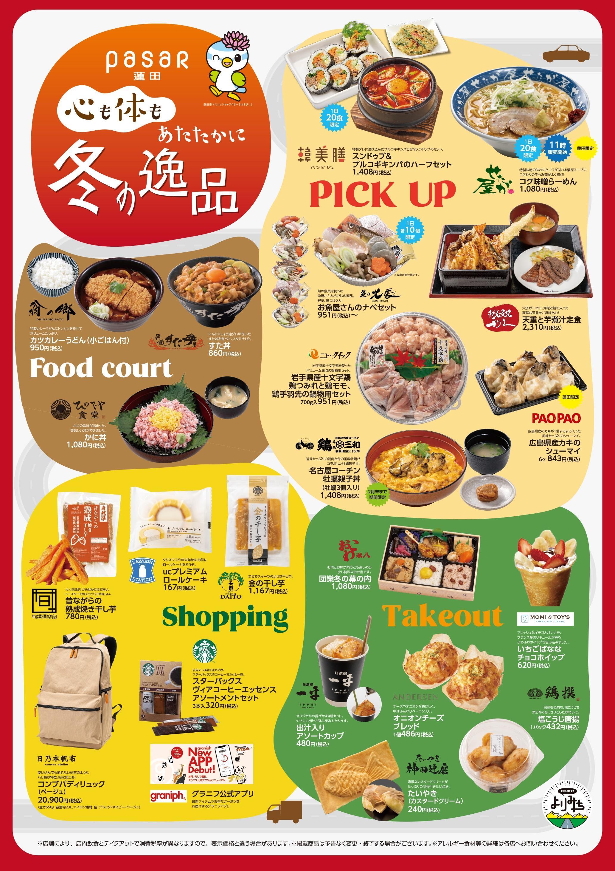 心も体もあたたかに『 冬の逸品 』 心も体もあたたかに 『 冬の逸品 』 いつもPasar蓮田をご利用いただきまして誠にありがとうございます(^^♪ 寒~い季節にピッタリの心も体も温まるメニューが勢ぞろい!(◍ ´꒳` ◍) あったかお鍋の具セットもご用意していますのでおうちごはんにオススメですよ♪ お近くにお越しの際は、ぜひこの機会にご利用くださいませ(*'▽')ノ ↓↓詳しくは画像をクリック!↓↓