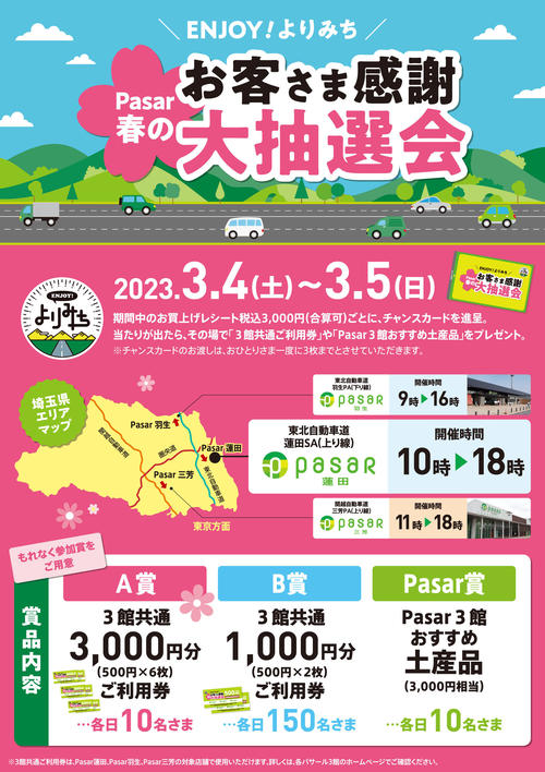 Pasar蓮田、Pasar羽生、Pasar三芳の3館合同の感謝抽選会を3月4日(土)・5日(日)に開催いたします!
