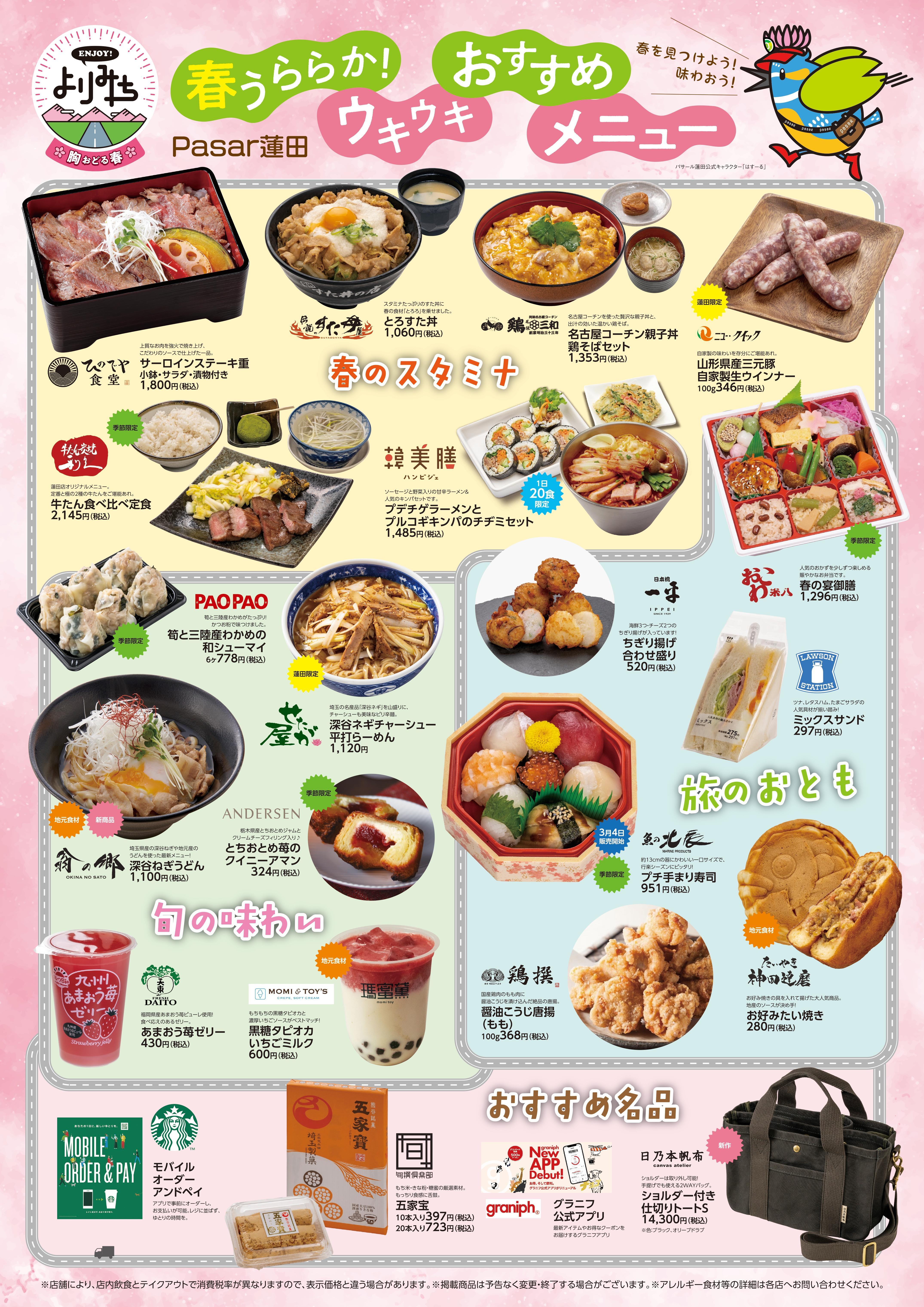 ENJOY!よりみち 春うららか!ウキウキおすすめメニュー 【お知らせ】 ENJOY!よりみち 春うららか!ウキウキおすすめメニュー いつもPasar蓮田をご利用いただきまして誠にありがとうございます(^^♪ 春のお出かけにぴったりのおすすめメニューが盛りだくさん!! ウキウキ気分が上がる新メニューや1日数量限定、蓮田限定商品も多数ございますので、ぜひお見逃しなく( *´﹀` *)v お近くにお越しの際は、ぜひこの機会にご利用くださいませ(*'▽')ノ ↓↓詳しくは画像をクリック!↓↓