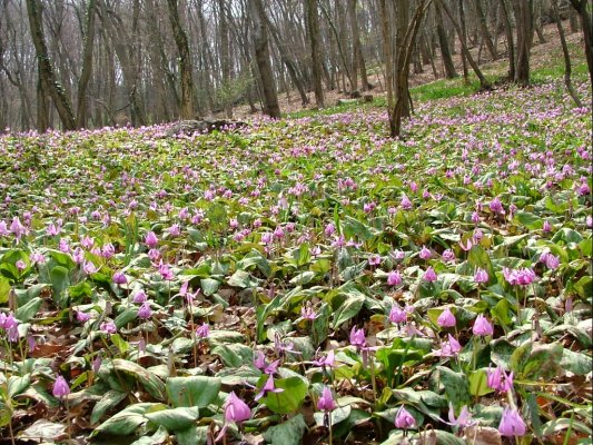 万葉集にも詠まれたみかも山の北斜面の中腹1.5ヘクタールに150万株の見事なカタクリが群生しています。3月中旬から4月上旬にかけて、可憐な紫色の花がいっせいに咲き揃い、白色の花をつけるアズマイチゲと競うように咲き乱れる光景には圧倒されます。