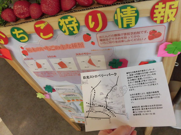 インフォメーションでは栃木県内のおすすめのイチゴ狩り情報をご案内しています♪いちごの摘み取りが楽しめる農園MAPをご用意しておりますのでぜひ佐野SAにお立ち寄りの際はインフォメーションにお越しくださいませ(*^_^*)