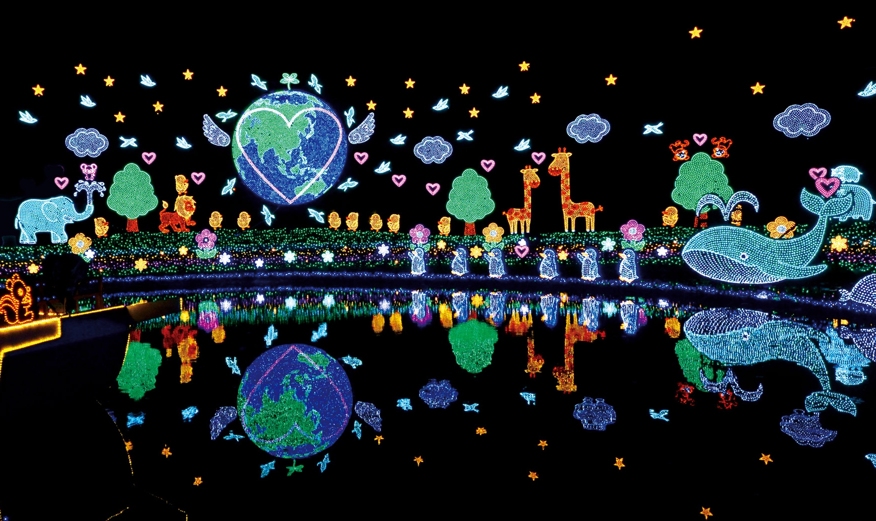 シンボルツリーである「奇蹟の大藤」は藤色の花房をイメージした電飾が咲き広がるストーリーを演出し、風に揺らめく様はまるで本物のようです。