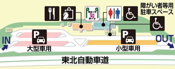 日光、鬼怒川方面から東京方面への最初のPAです。段差がなくフラットな敷地の中に、買う・食べるの施設が充実。天気の良い日は広い園地でくつろぐのもいいでしょう。