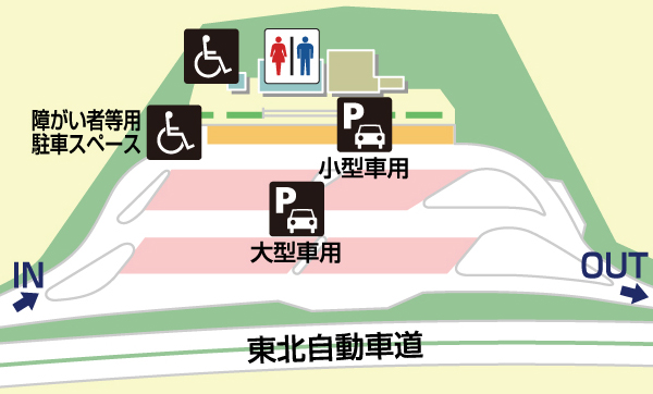 - 障がい者等用駐車場の設置、オストメイト対応トイレの整備等、バリアフリー化が行われているサービスエリアです。