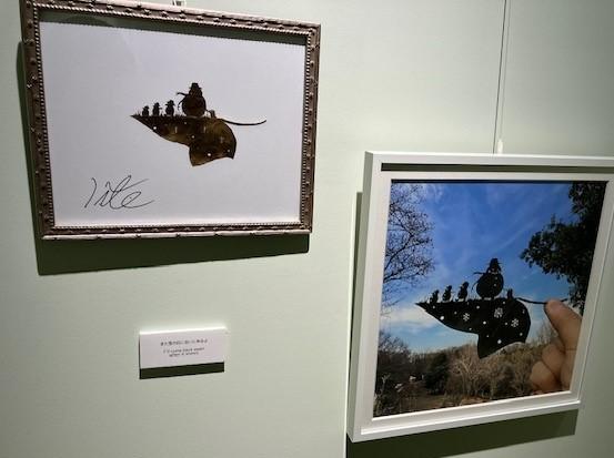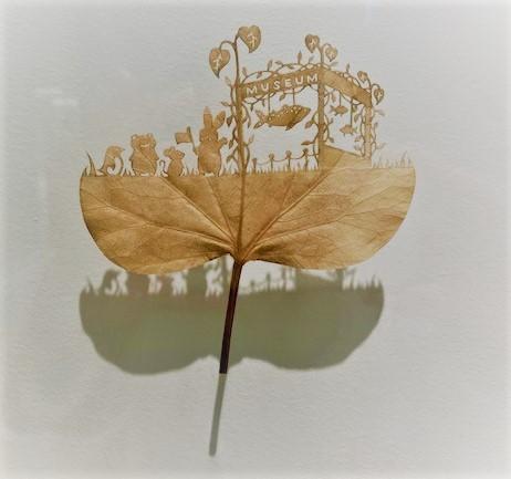 葉っぱ切り絵アーティスト、リトさんが作る作品が展示されています。