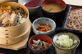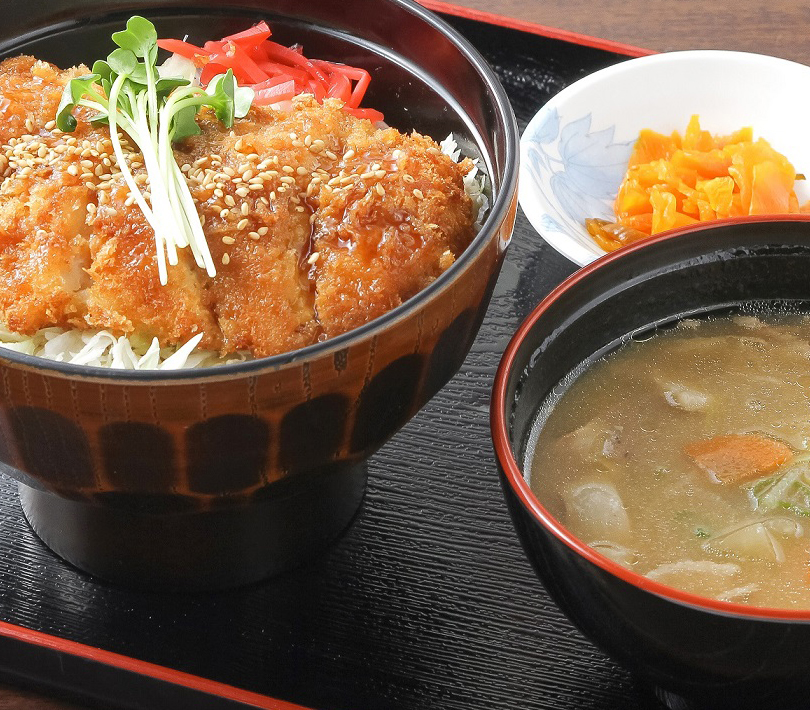 にんにくが効いた甘辛のタレで焼き上げた麓山高原豚のバラ肉にえごま入りの具沢山ラー油をかけて食べるスタミナ満点の丼ぶり。