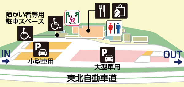 - 障がい者等用駐車場の設置、オストメイト対応トイレの整備等、バリアフリー化が行われているサービスエリアです。