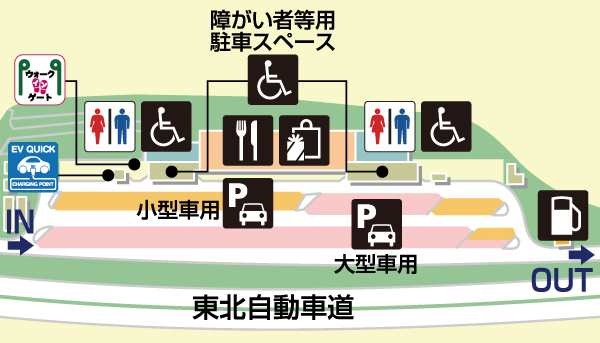国見SA・下りでご利用いただける、各種施設・サービスのご紹介です。
