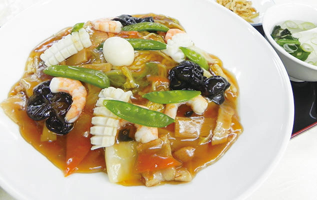 当店オープンからのロングセラーヒットメニューです。具材たっぷりの醤油風味あんかけ焼きそばです。