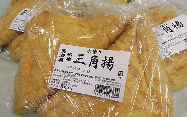 地元、大崎市の「佐藤食品」の自信作。分厚く大きな揚げは煮ても焼いてもOK!食べごたえも十分。当店でしか買えない一品。