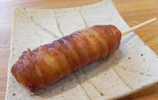ご飯を豚バラ肉で巻いた肉巻きおにぎりです。中にはチーズがはいっています。