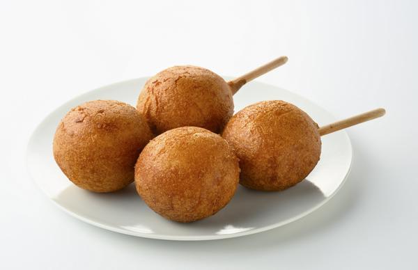 阿部蒲鉾店さんの人気フード「ひょうたん揚げ」。丸いボール状の蒸しかまぼこをほんのり甘い衣で包んで揚げたアメリカンドッグ風スナックは1本1本手作り。かわいらしい"ひょうたん"の形に揚げられています。小腹を満たすのに最適です!1本 450円(税込)