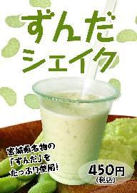 まろやかなミルクベースと宮城名物ずんだをバランスよく合わせたご当地シェイクです。枝豆の香りとつぶつぶ食感が楽しめます。450円(税込)