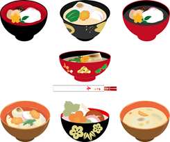 あんこもち、雑煮、しょうがもち、大根おろし、たくあんなどが
