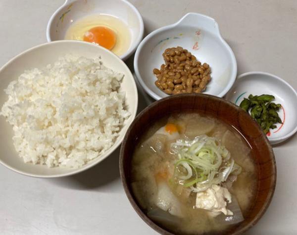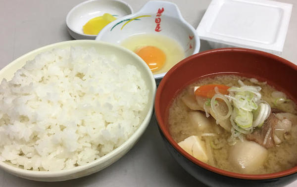 朝に人気のメニューです。玉ねぎ、ゴボウ、大根など具沢山のとん汁は店内で丁寧に仕込み。