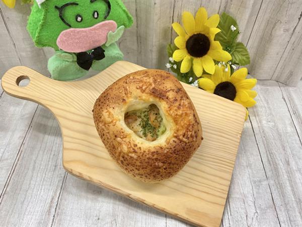 歯切れの良い生地でオニオン入りグラタン風ホワイトソースを包み、角切りチキンを乗せて焼き上げた旨味が溢れる惣菜パンです