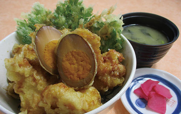 鶏の天ぷら5個、ゆで卵、春菊の天ぷらがついてこのボリューム。当店人気№1メニューです。
