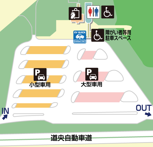 - 障がい者等用駐車場の設置、オストメイト対応トイレの整備等、バリアフリー化が行われているサービスエリアです。