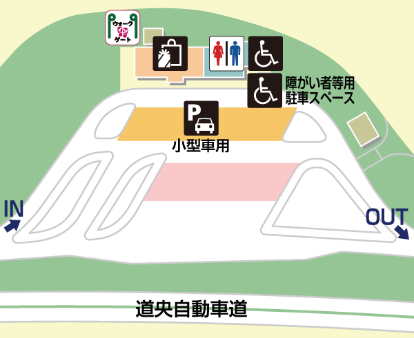 - 障がい者等用駐車場の設置、オストメイト対応トイレの整備等、バリアフリー化が行われているサービスエリアです。