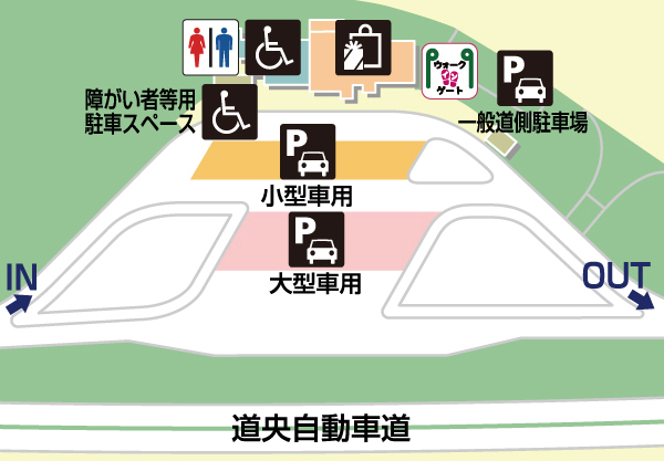 - 障がい者等用駐車場の設置、オストメイト対応トイレの整備等、バリアフリー化が行われているサービスエリアです。