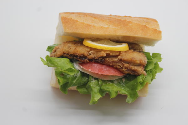 ジンジャーソースでマリネしたサバにオリーブオイル レモンをかけバケットで挟んだ米山のご当地グルメ。